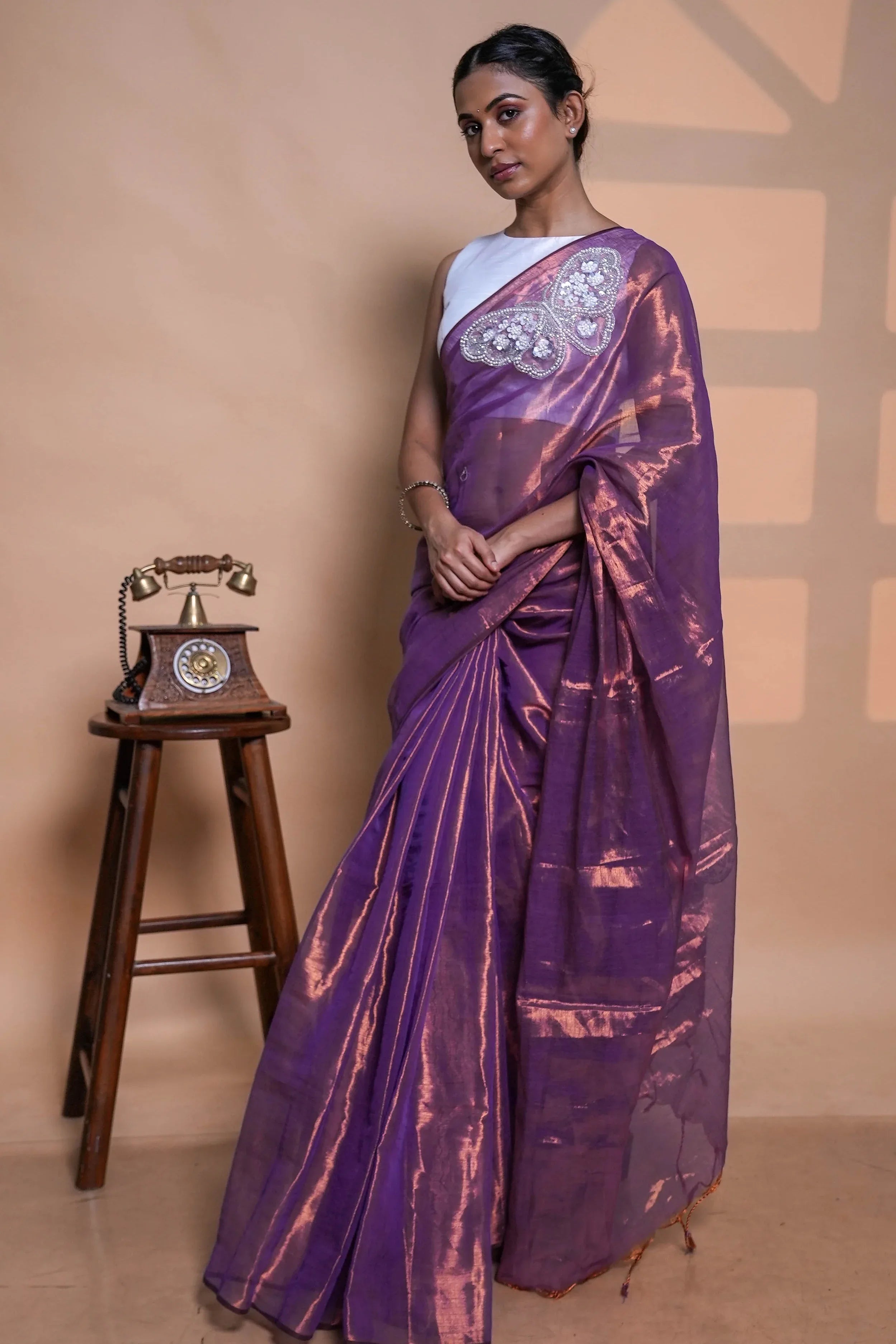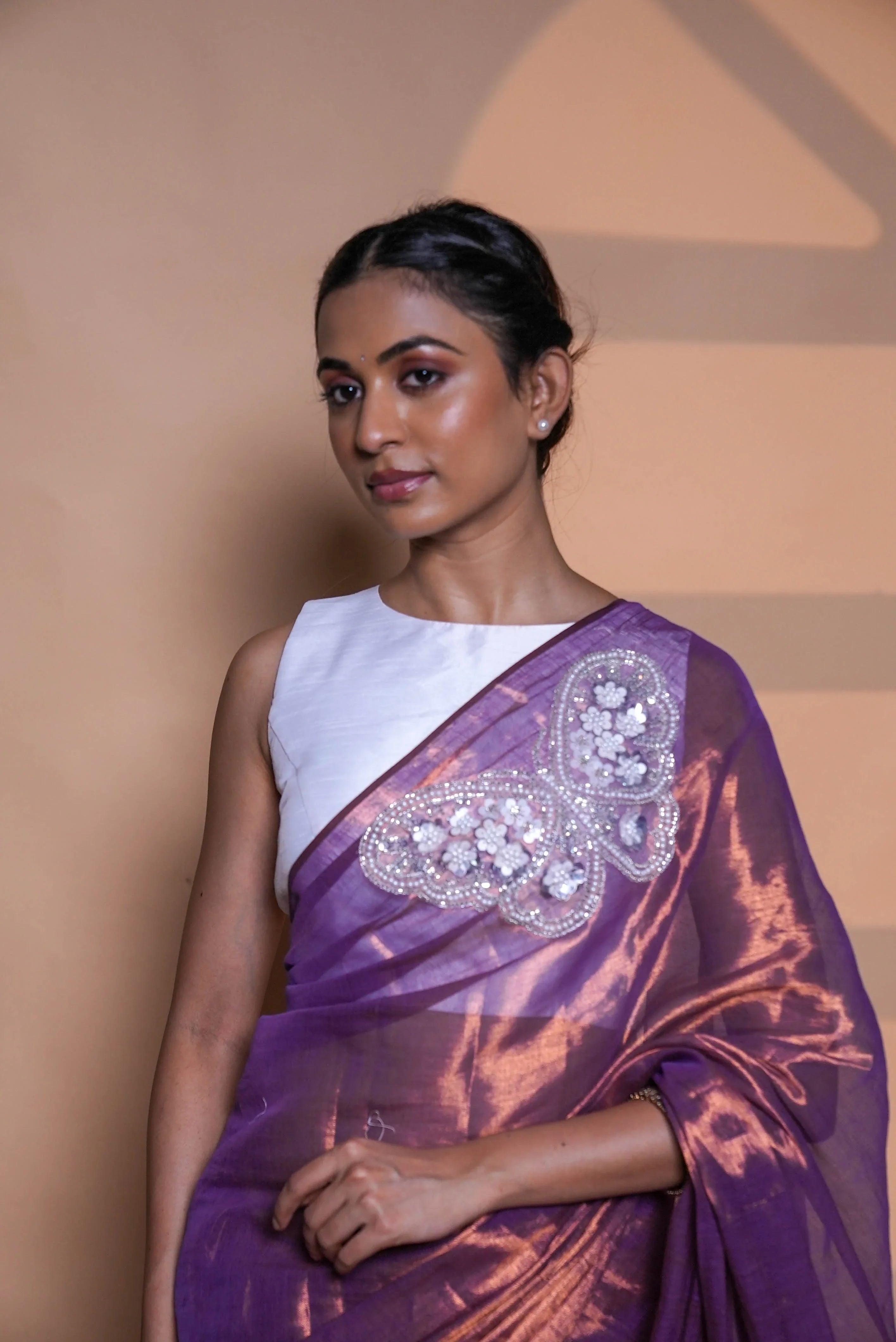 A luminous violet silk saree with a soft metallic sheen, Iris Whisper captures elegance in motion. The pallu features a handcrafted butterfly motif — intricately embellished with pearls, sequins, and fine silver thread, symbolizing transformation and grace. The white blouse adds a modern balance, letting the shimmer and artistry of the drape take center stage.
