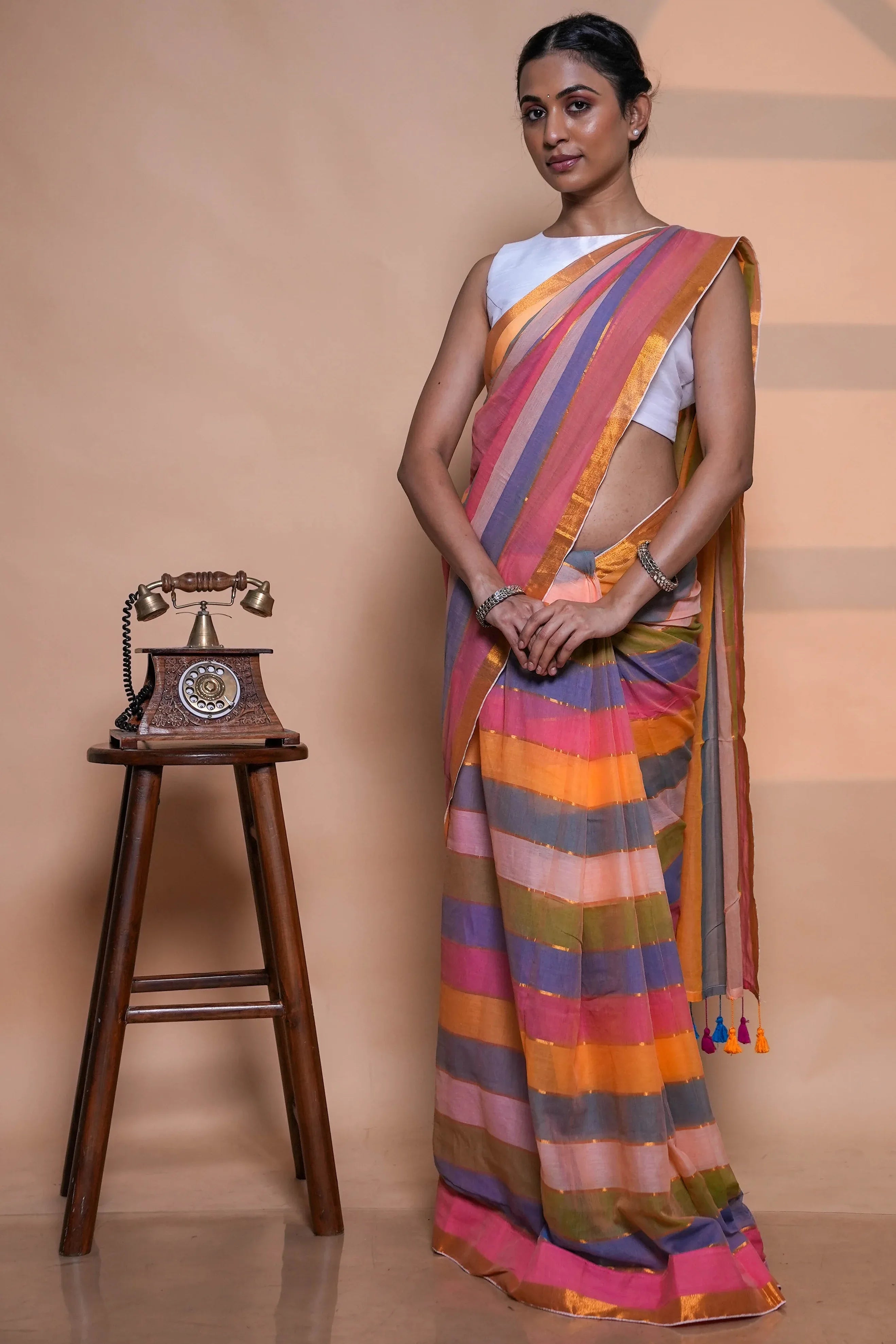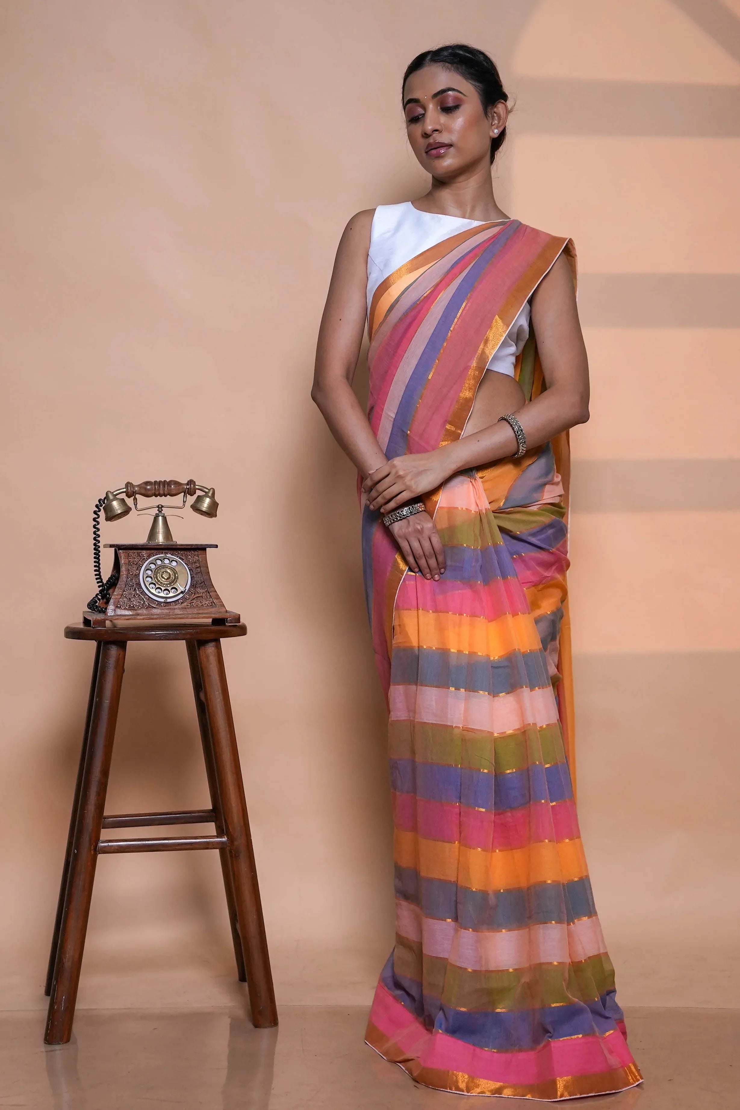 Each saree is crafted by skilled artisans who breathe life into every thread, creating a piece that’s both classic and refreshing. The stripes lend a subtle structure and sophistication, making this saree versatile enough for office wear, casual outings, or even intimate festive gatherings.